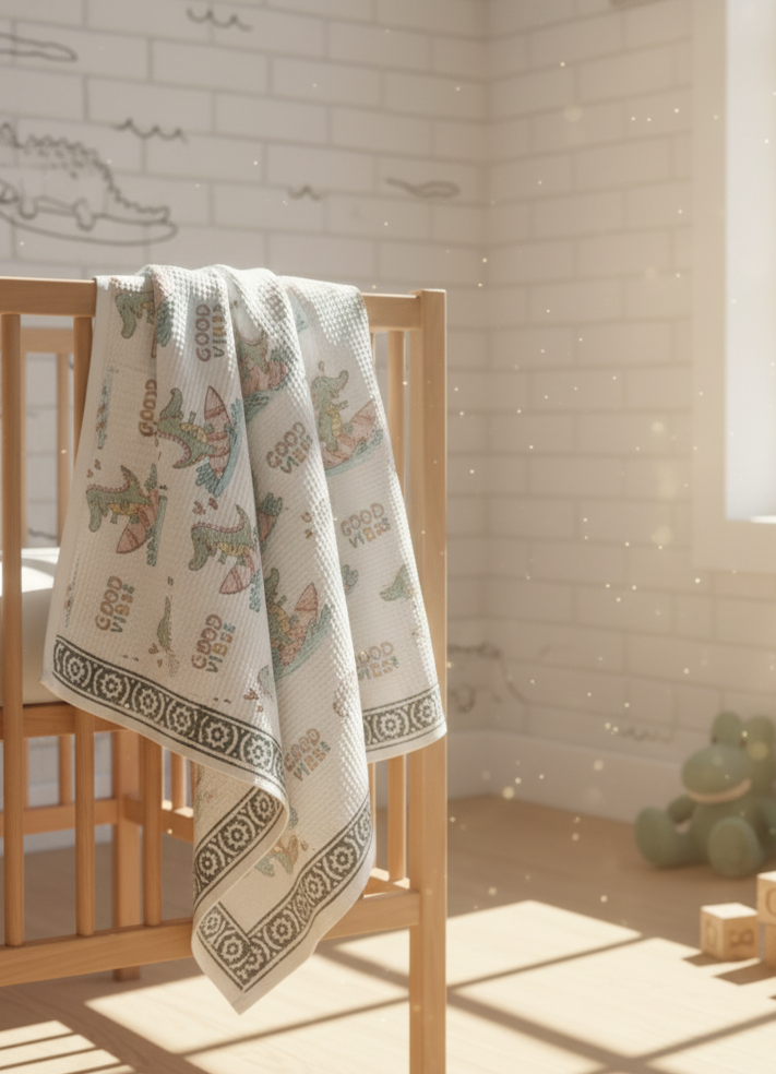 A splash of sunshine and smiles! The Surf Croc Hooded Baby Towel brings joyful charm to bath time. Hand block printed by Jaipur artisans, this soft waffle cotton towel features a cheerful crocodile surfing over waves with “Good Vibes” playfully printed across.