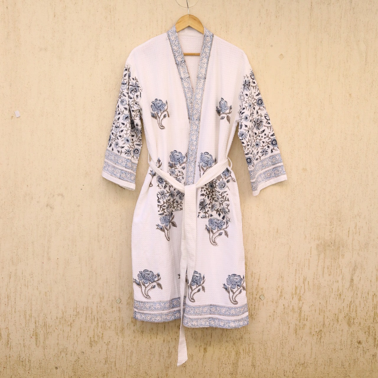 Ethereal and timeless, the Indigo Gulmohar Bathrobe embodies Jaipur’s understated elegance. Hand block printed in serene indigo tones on soft waffle cotton, it offers a breathable, textured comfort that wraps you in everyday luxury. Finished with floral borders and a relaxed fit, it’s the perfect robe for slow mornings, cozy evenings, and mindful living.