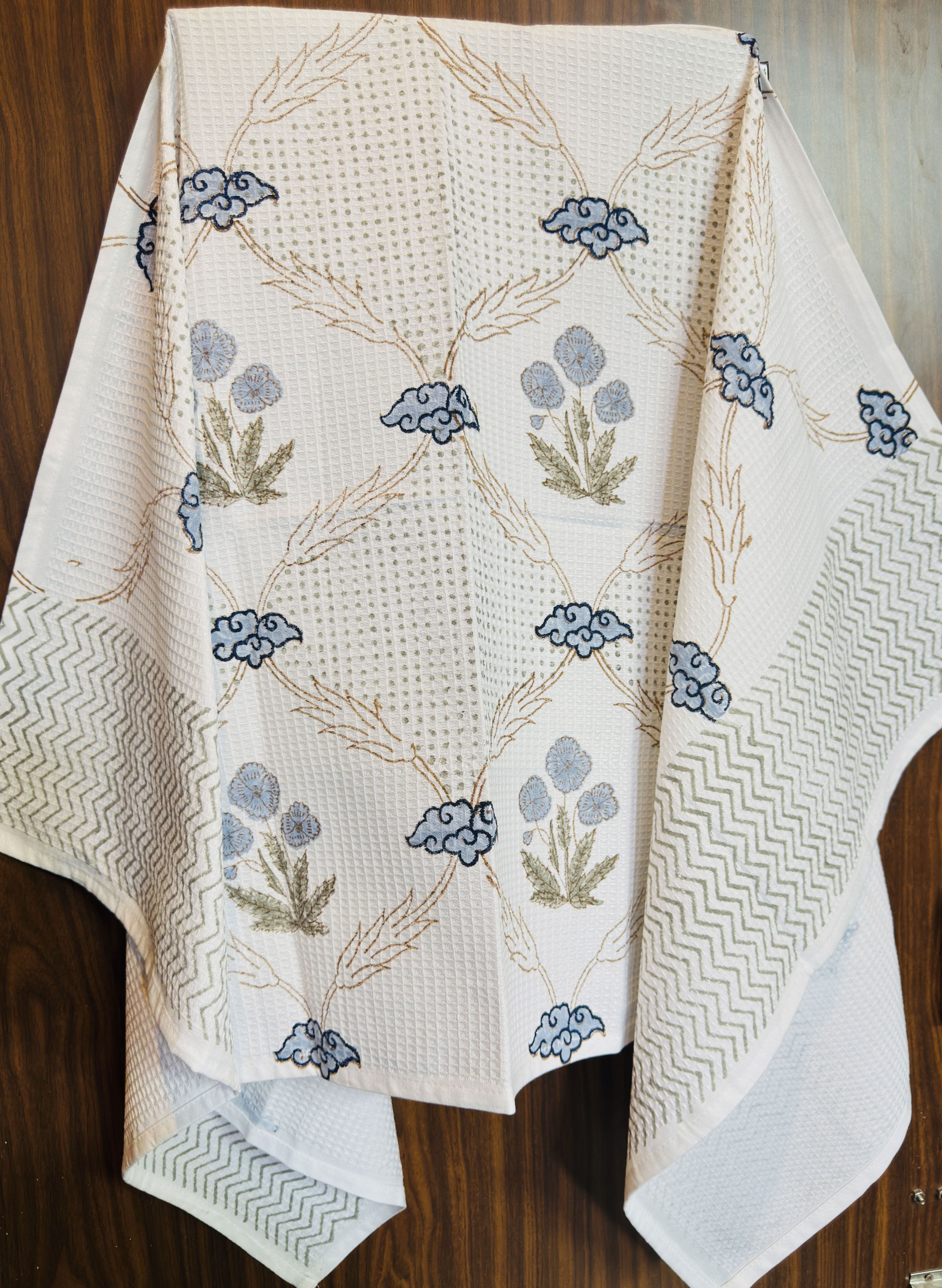 Handcrafted in Jaipur, the Newkasa Vaayuna Cotton Waffle Bath Towel features airy Jaipuri hand block prints in blue, gold, and olive motifs. Made from 100% soft cotton, this lightweight waffle towel is absorbent, breathable, and quick-drying — a perfect blend of comfort and artisanal elegance.