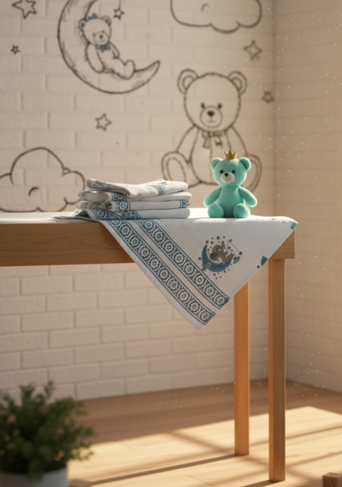 Say hello to Sleepy Bear, your baby’s new bedtime buddy. Handblock printed by Jaipur artisans on soft waffle-weave cotton, this towel captures a little bear resting on the crescent moon surrounded by twinkling stars. Lightweight, highly absorbent, and baby-skin-gentle, it makes bath time (or nap time) calm and cozy. Perfect for gifting new parents or wrapping tiny dreamers in handcrafted comfort.