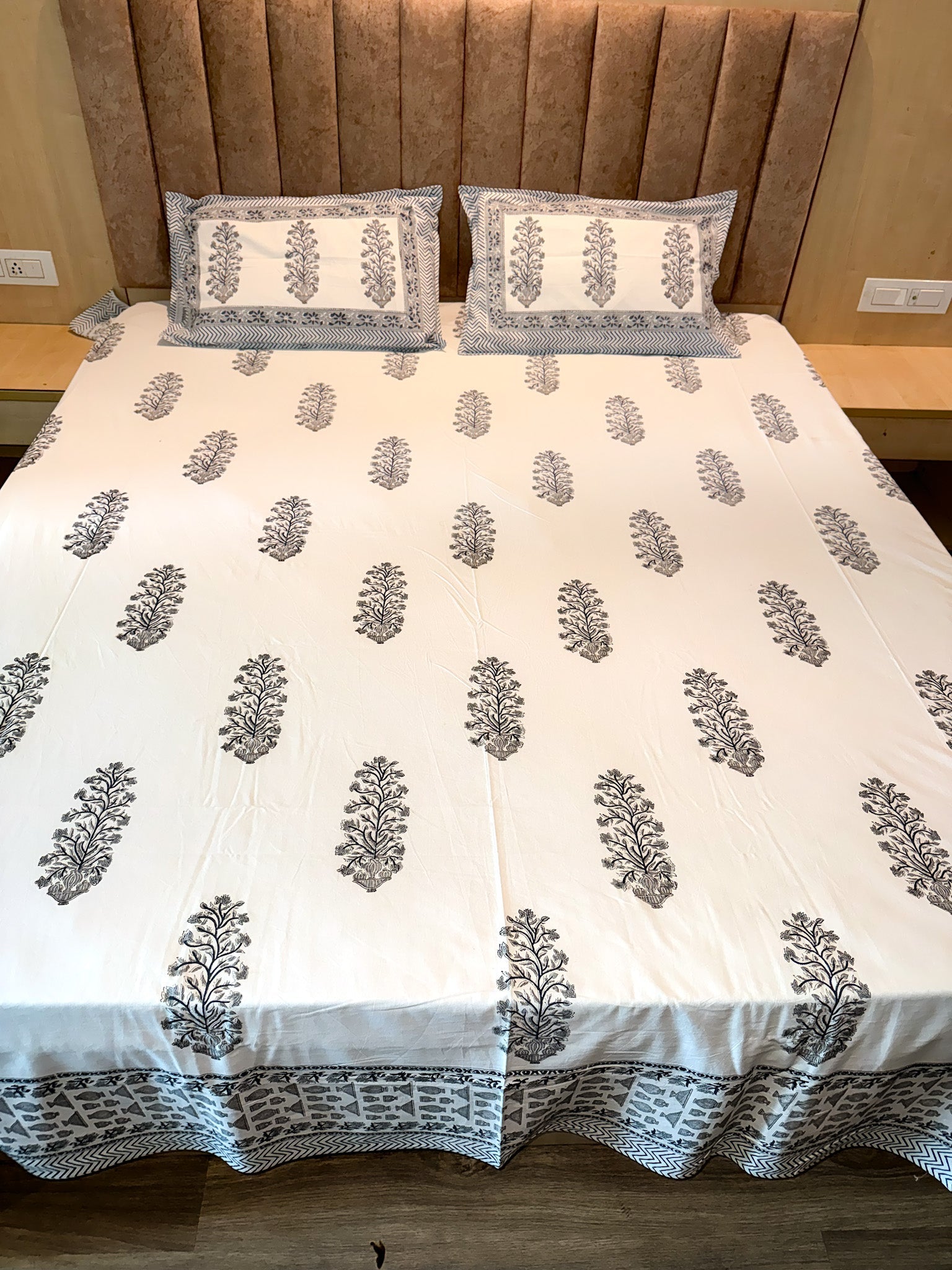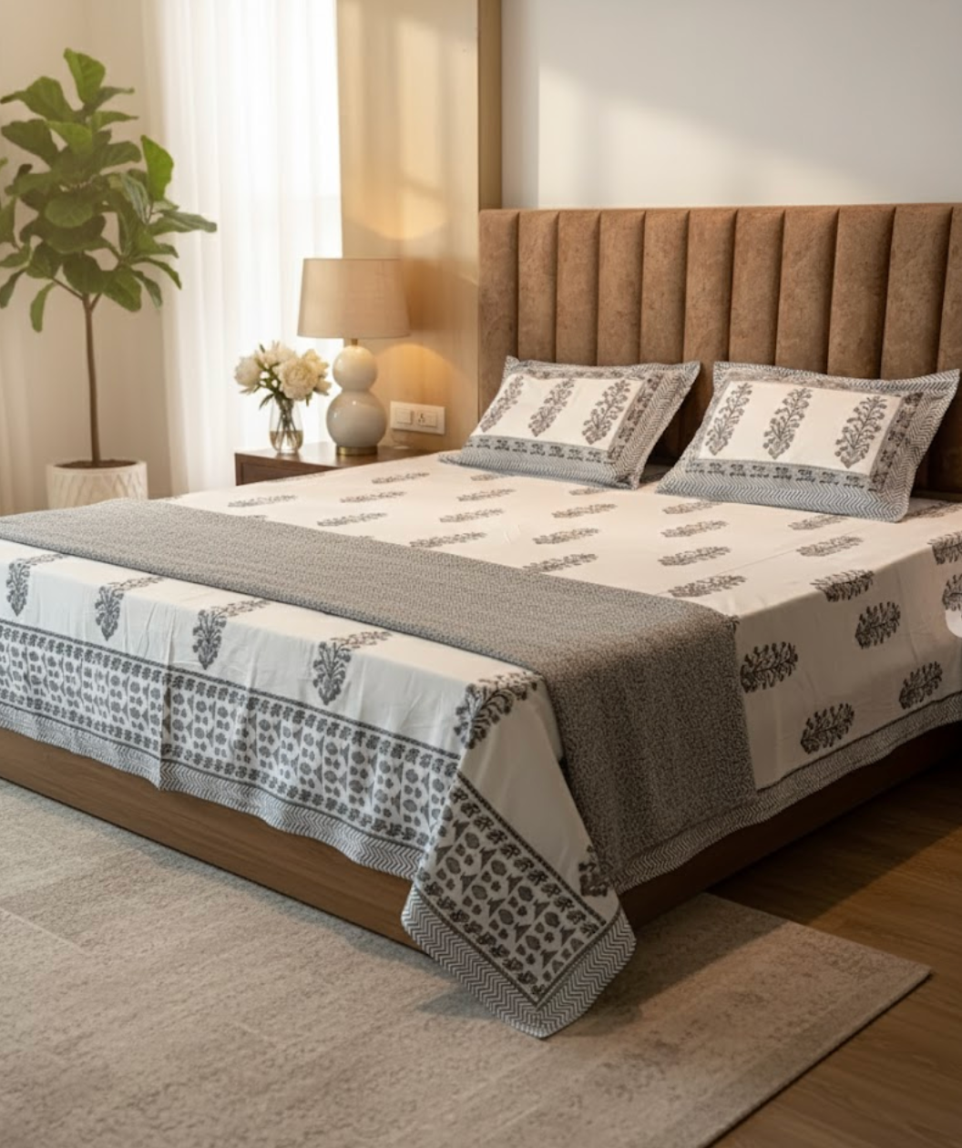 Hand-crafted by skilled artisans in Jaipur, this bedsheet brings timeless elegance to your home. Featuring intricate hand block printed marigold vine motifs in a classic black and white, grey palette, it combines heritage artistry with modern minimalism. Made from fine 350 thread count cotton, it offers a smooth, breathable, and long-lasting comfort.
