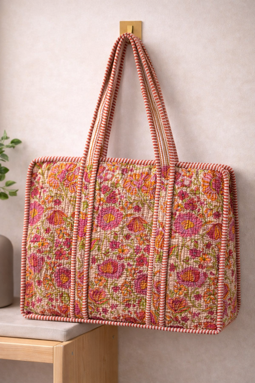 A celebration of blooming florals and warm sunshine tones, this quilted cotton tote is designed for effortless everyday elegance. The soft peach base paired with vibrant pink blossoms and striped detailing gives it a charming handcrafted feel.Lightweight yet structured, spacious yet graceful — this tote carries your day with ease, whether it’s work, travel, or a relaxed outing. Handcrafted with care, stitched with comfort.