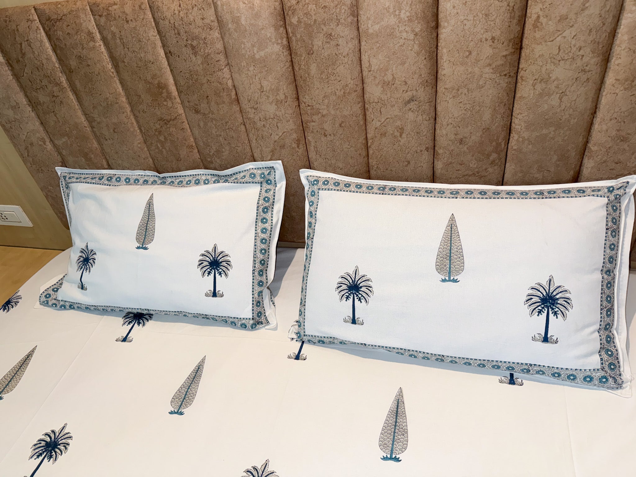 Crafted with precision and heritage, this hand block printed bedsheet brings the timeless artistry of Jaipur into your home. Adorned with palm tree and floral buta motifs, its intricate border frames the design with quiet elegance. Woven from pure cotton, the fabric is soft, breathable, and effortlessly graceful — perfect for year-round comfort. This set includes two matching pillow covers, each finished with a delicate printed chain to complete the ensemble.