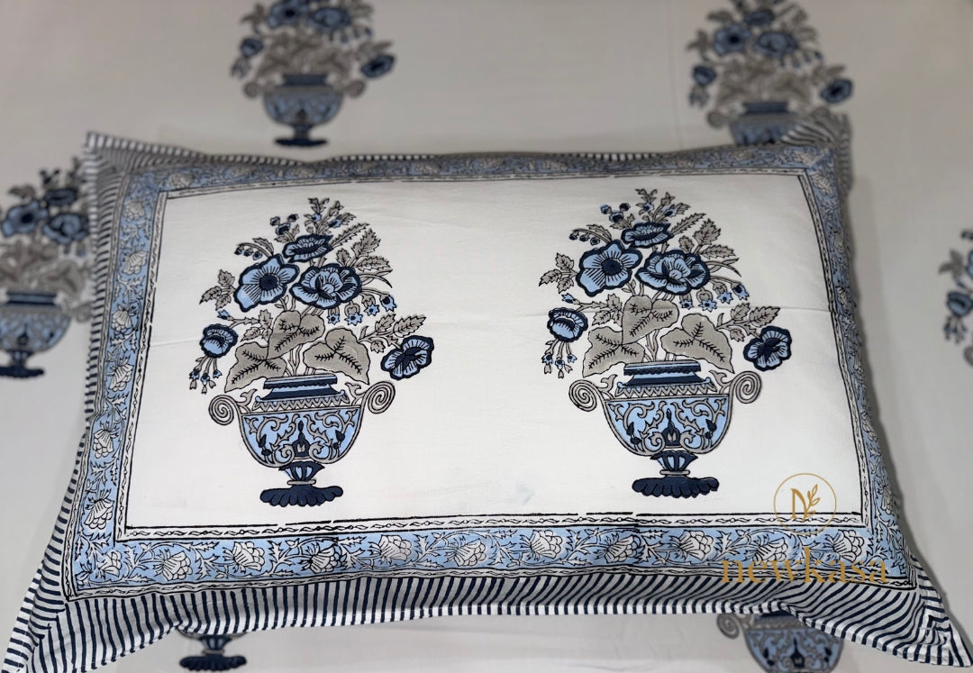 Elevate your bedroom with the Ambar Phool – Jaipuri Hand Block Cotton Bedsheet by Newkasa. Handcrafted in Jaipur, this king-size (108x108) bedsheet features exquisite blue floral vase motifs, delicately block printed using traditional wooden blocks. Finished with a finely detailed border, it blends heritage artistry with everyday comfort. Made from 100% breathable cotton