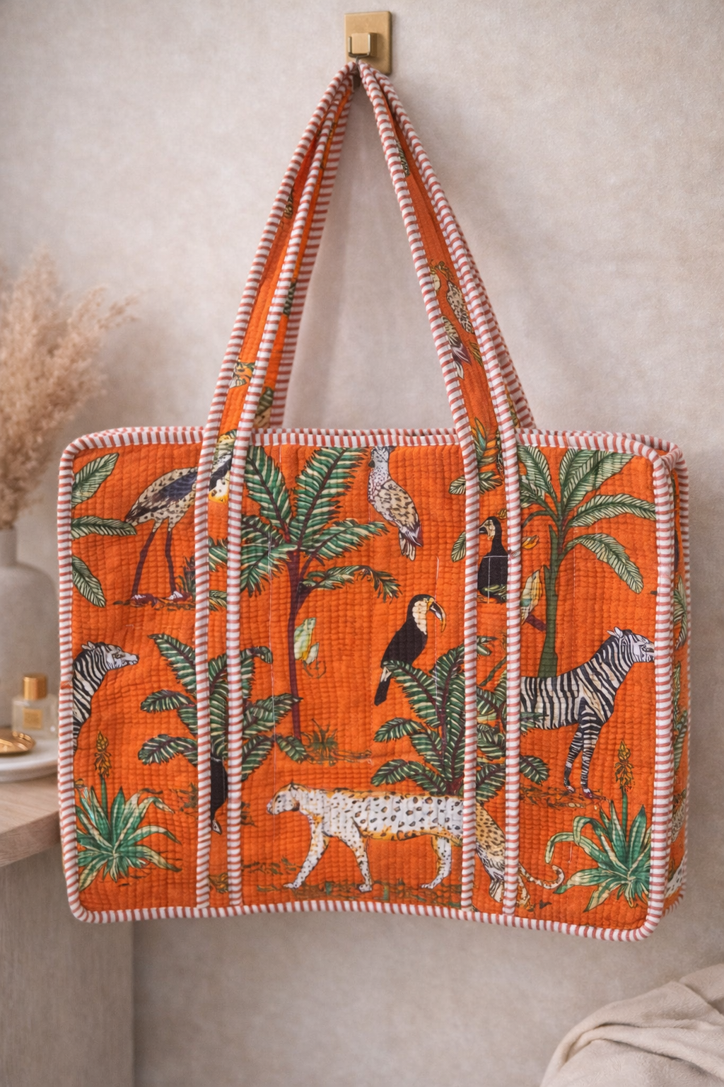 Vibrant and full of life, this quilted cotton tote features bold jungle prints on a rich orange base. Designed for everyday ease, it offers spacious storage, sturdy shoulder straps, and lightweight durability. Perfect for office, shopping, or travel, this tote adds a cheerful yet confident touch to your daily style.